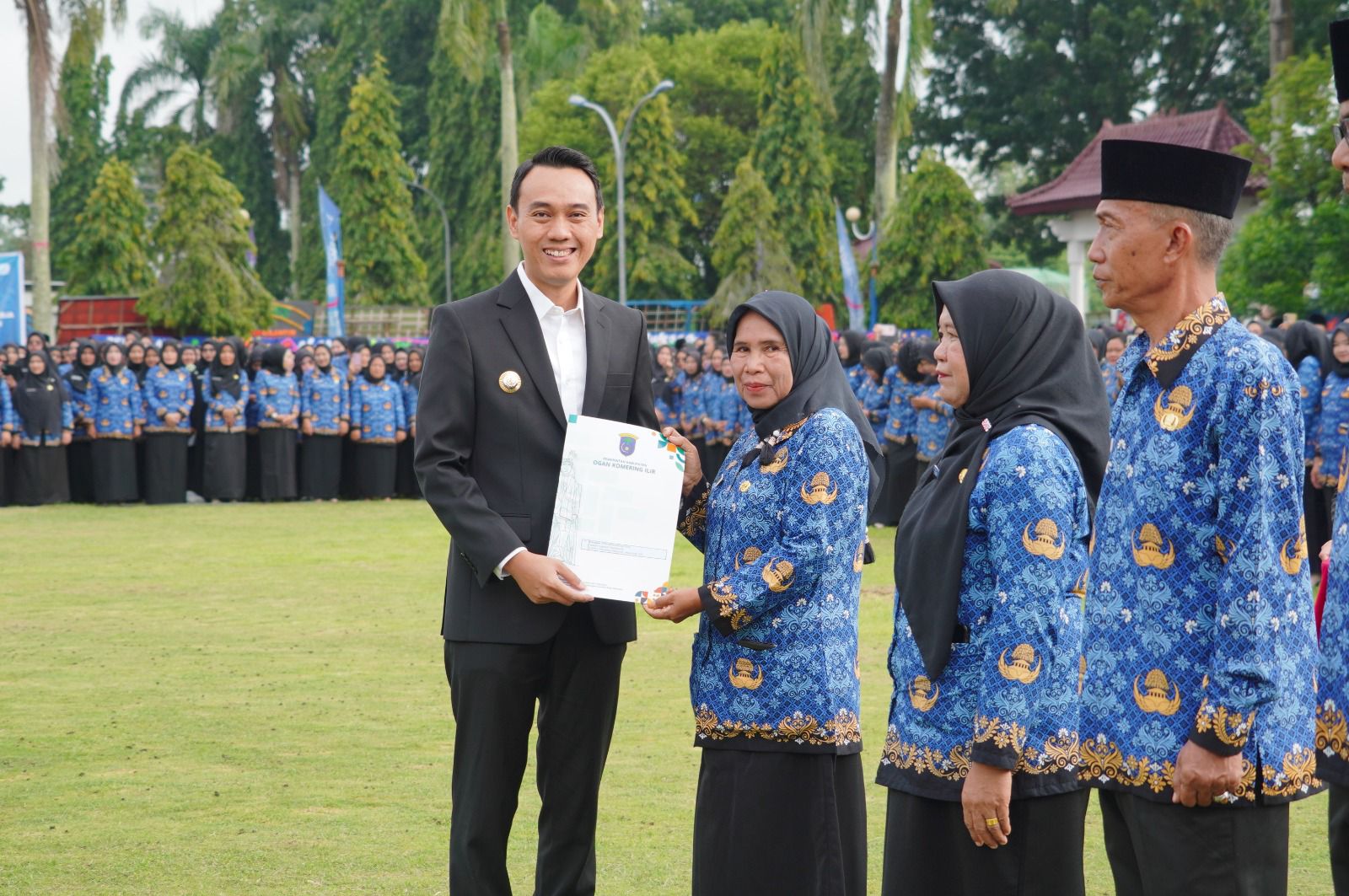 Acara penyerahan Surat Keputusan (SK) PPPK paruh waktu dilaksanakan secara simbolis di Lapangan Upacara Kantor Bupati OKI, Senin (29/12/2025). Prosesi dipimpin langsung oleh Bupati OKI H. Muchendi, yang menyerahkan SK kepada perwakilan tenaga honorer dari berbagai instansi.