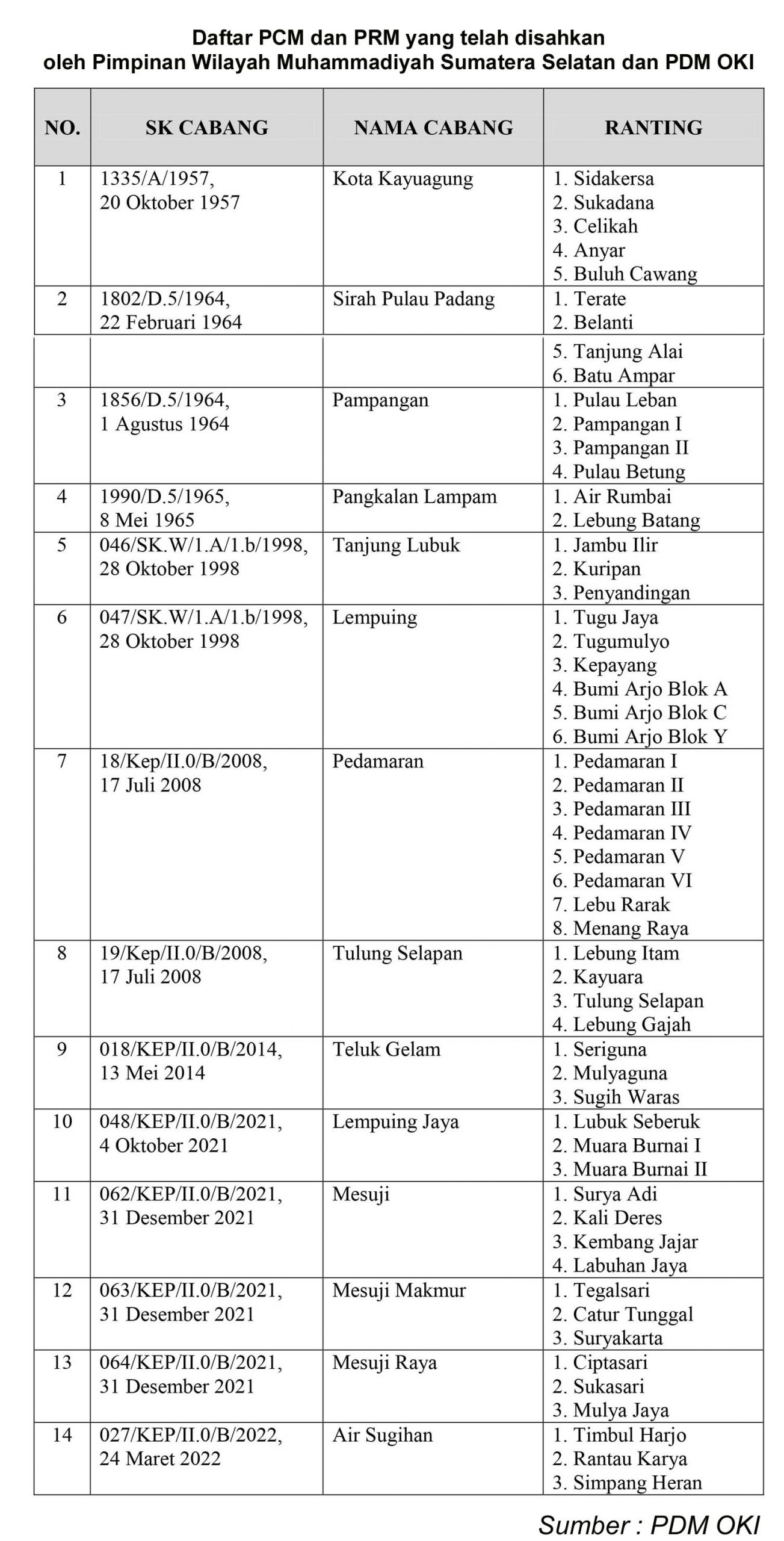 Daftar PCM dan PRM yang telah disahkan oleh Pimpinan Wilayah Muhammadiyah Sumatera Selatan dan PDM OKI, yaitu: