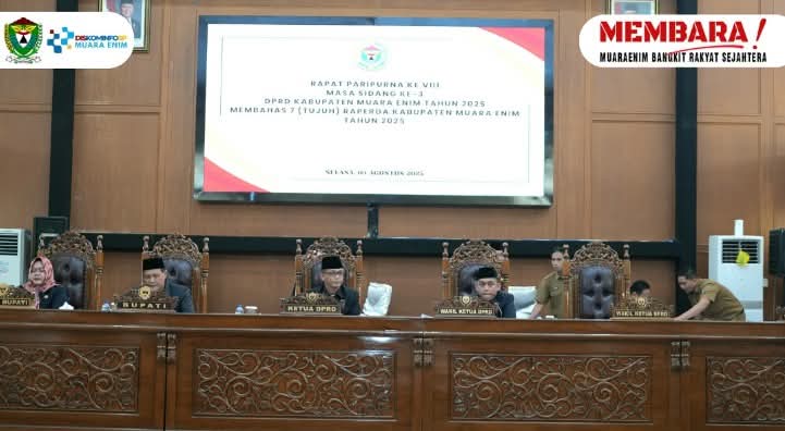 Muara Enim, cimutnews.co.id – Bupati Muara Enim H. Edison, S.H., M.Hum., didampingi Wakil Bupati Muara Enim, Ir. Hj. Sumarni, M.Si., menyampaikan penjelasan terhadap 7 Rancangan Peraturan Daerah (Raperda) Kabupaten Muara Enim Tahun 2025 kepada Dewan Perwakilan Rakyat Daerah (DPRD) Kabupaten Muara Enim, Selasa (05/08) dalam Rapat Paripurna VII Masa Rapat I di Ruang Rapat Paripurna DPRD Kabupaten Muara Enim.