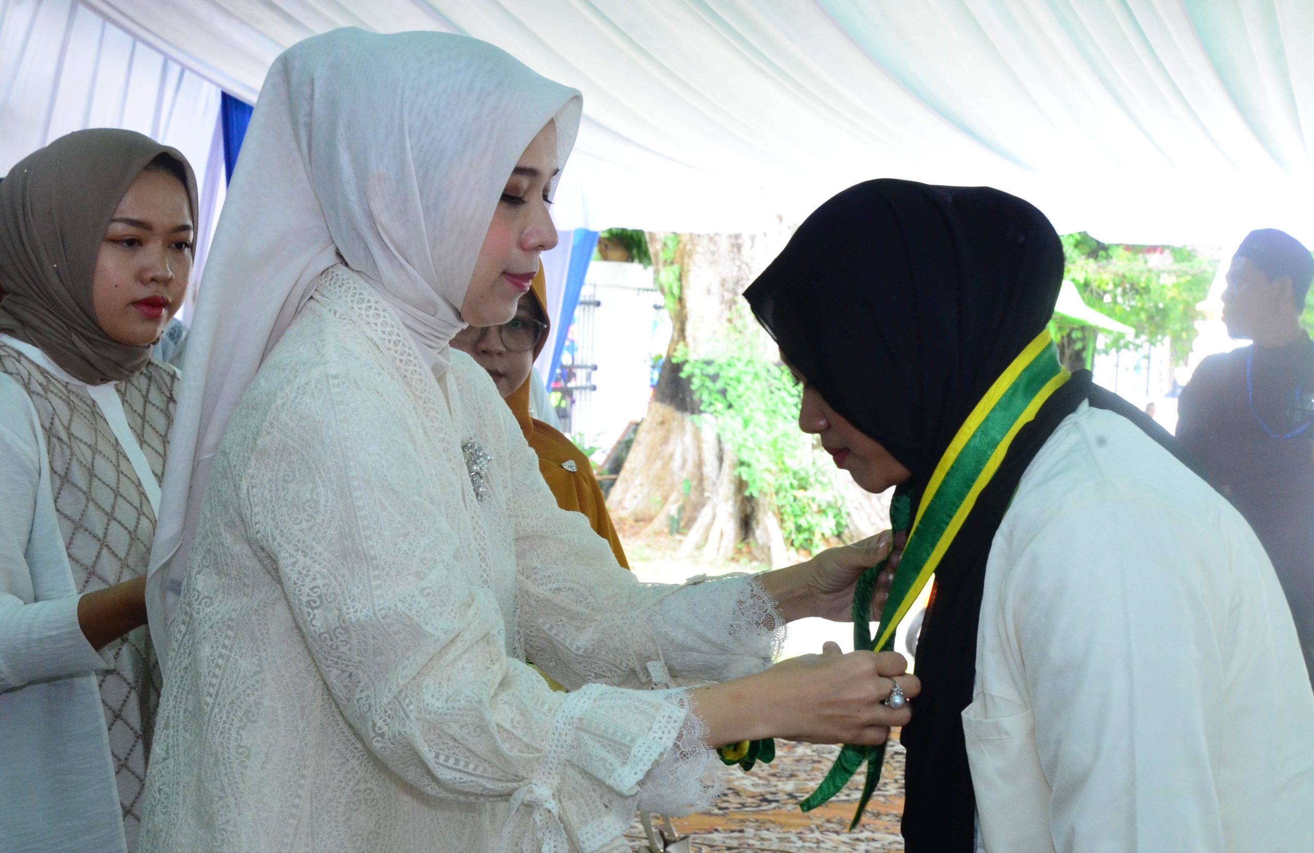 Pengalungan Gordon oleh Ike Meilina, M.Si, Ketua TP PKK OKI sekaligus Anggota DPRD Sumsel,