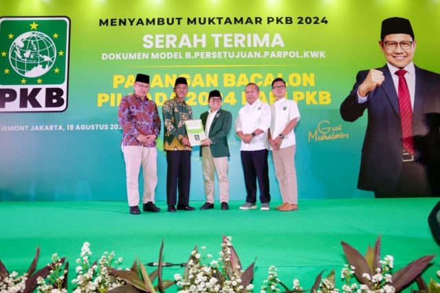 cimutnews.co.id. OKI – Ketua Umum Partai Kebangkitan Bangsa (PKB) Muhaimin Iskandar alias Cak Imin menyerahkan dokumen model B Persetujuan Parpol KWK (B1KWK) untuk pasangan H.M. Dja’far Shodiq dan Abdiyanto SH MH di Pemilihan Bupati dan Wakil Bupati (Pilbup) Ogan Komering Ilir (OKI) 2024.