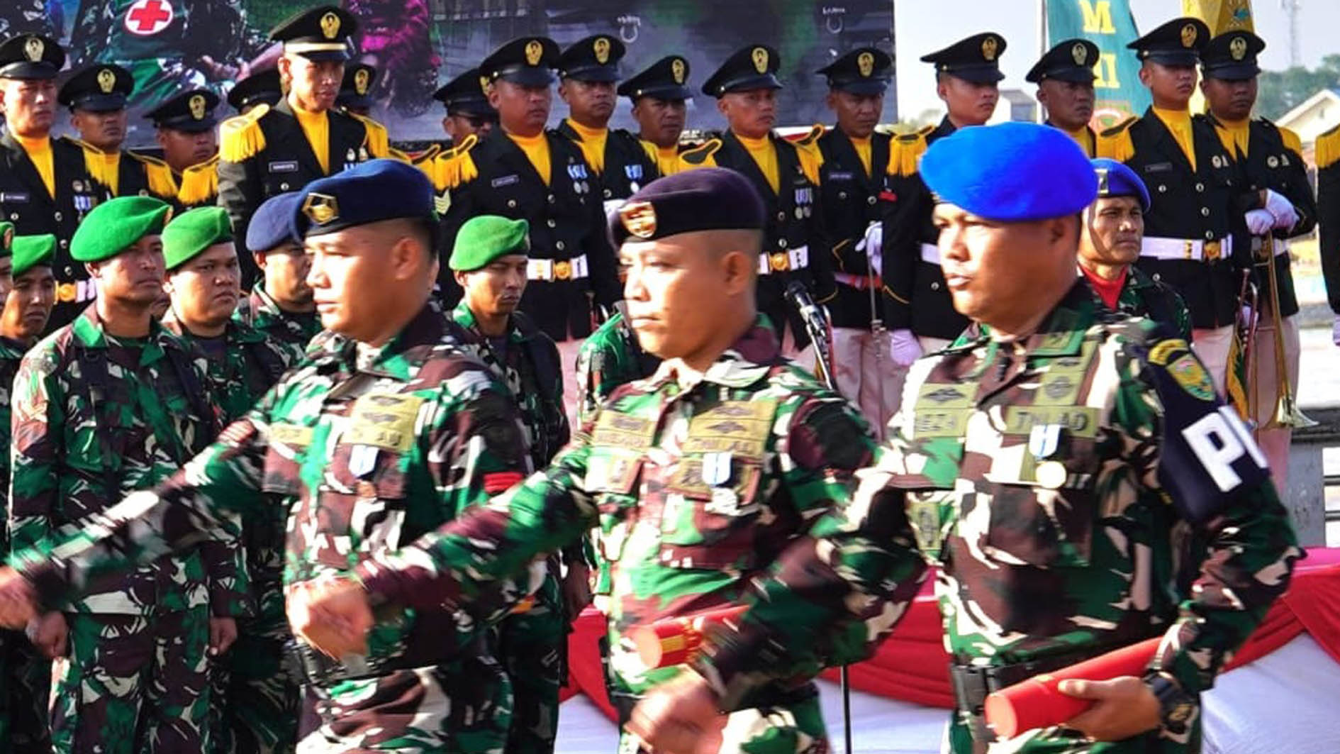 Suasana semakin khidmat ketika penghormatan bendera Merah Putih dikumandangkan, diikuti pembacaan amanat Panglima TNI dan penyerahan tanda kehormatan kepada para prajurit berprestasi.