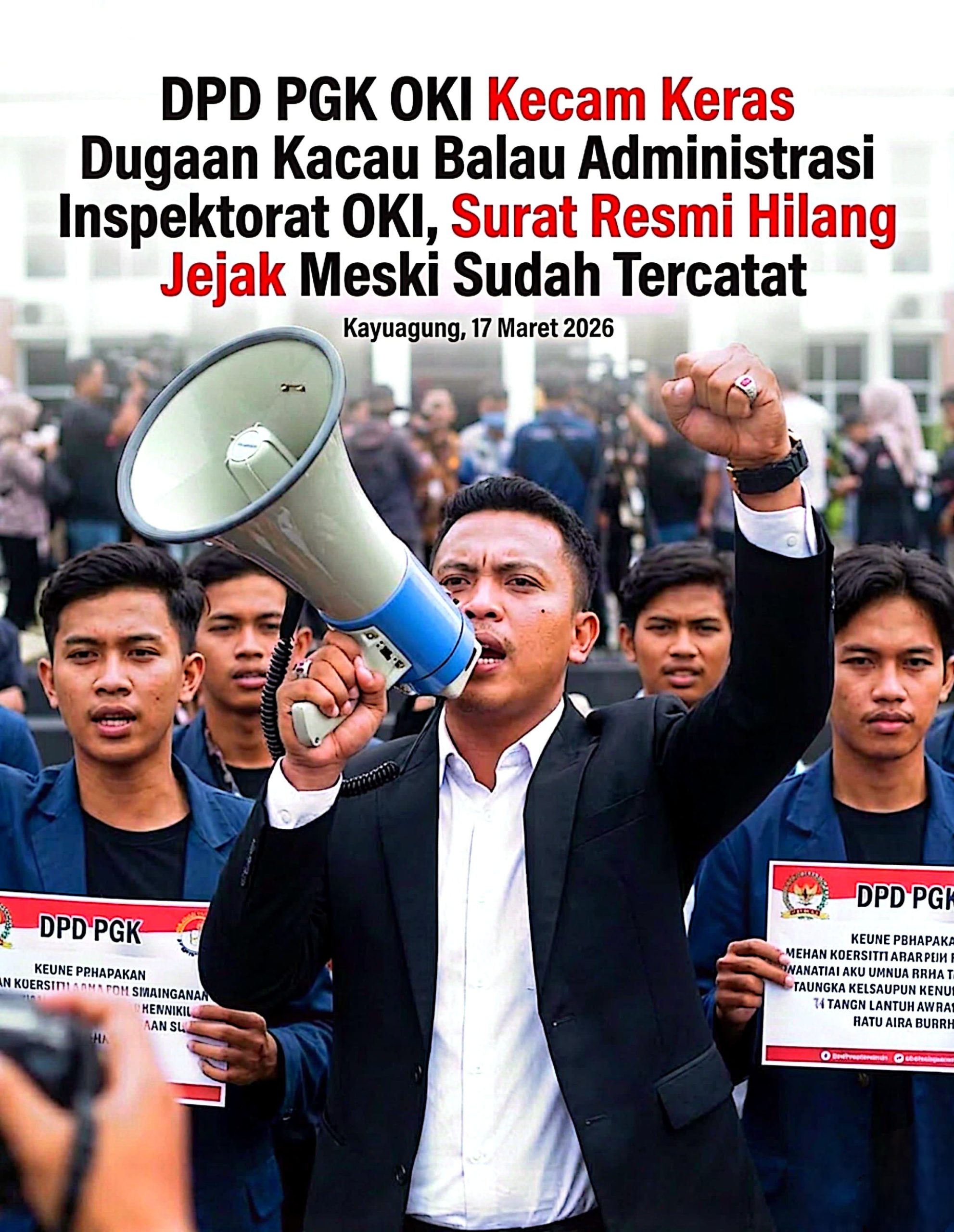 Kayuagung, cimutnews.co.id – DPD Perkumpulan Gerakan Kebangsaan (PGK) Kabupaten Ogan Komering Ilir (OKI) melayangkan kritik terbuka terhadap Inspektorat OKI terkait dugaan buruknya tata kelola administrasi, setelah surat resmi yang telah tercatat justru tidak dapat ditelusuri keberadaannya. Peristiwa ini mencuat pada Selasa (17/3/2026) dan dinilai mencerminkan lemahnya sistem pengelolaan internal di lembaga tersebut.