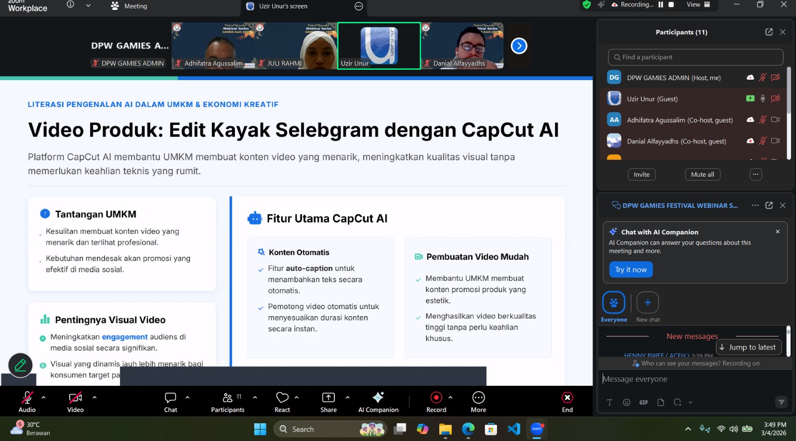 Webinar ini menghadirkan Uzir, S.ST., ITPMCP sebagai narasumber yang membahas penerapan teknologi AI secara praktis dan mudah dipahami bagi pelaku Usaha Mikro, Kecil, dan Menengah (UMKM) serta sektor ekonomi kreatif. Diskusi dipandu oleh Julia Rahmi sebagai moderator dan dibuka langsung oleh Ketua DPW GAMIES Provinsi Aceh, Adhifatra Agussalim, sebagai keynote speaker.