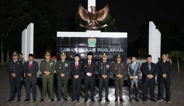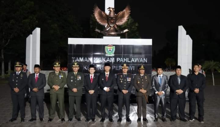 cimutnews.co.id. Muara Enim – Tepat Pukul 00.00 WIB, Pj. Bupati Muara Enim, H. Henky Putrawan bersama Ketua DPRD Kabupaten Muara Enim, Liono Basuki dan anggota Forkopimda lainnya, Sekretaris Daerah Kabupaten Muara Enim, Ir. Yulius, M.Si., beserta seluruh kepala perangkat daerah melaksanakan apel kehormatan dan renungan suci di Taman Makam Pahlawan Ksatria Pertiwi, Muara Enim. Sabtu (17/08).