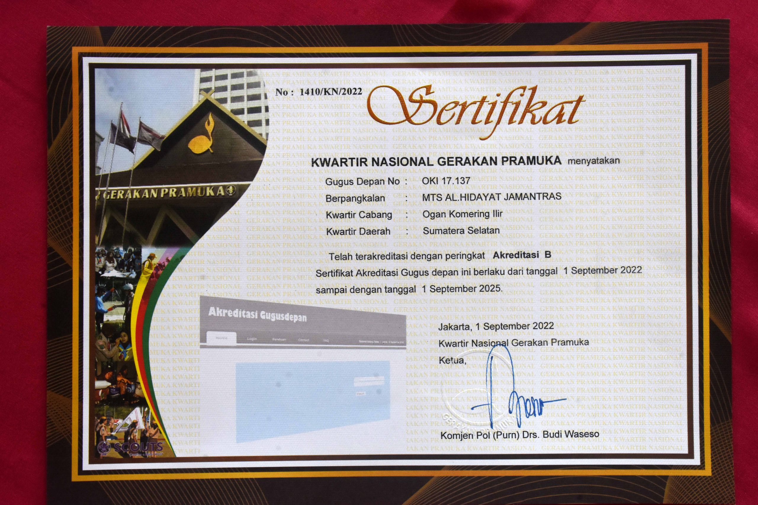 Pada waktu acara pembukaan Bumi Perkemahan di PP Al-Hidayat Jamantran dilaksanakan juga Serah terima sertifikat dari Kwartir Nasional Gerakaran Pramuka yang menyatakan Gugus Depan No. OKI 17.137 berpangkalan MTS Al Hidayat Jamantras Kwartir Cabang Ogan Komering Ilir Kwartir Daerah Sumatera Selatan telah terakreditasi dengan peringkat AKREDITASI B. Sertifikat Akreditasi Gugus Depan ini berlaku dari tanggal 1 September 2022 sampai dengan tanggal 1 September 2025 yang ditandatangani oleh Komjen Pol (Purn) Drs. Budi Waseso Ketua Kwartir Nasional Gerakan Pramuka Jakarta, 1 September 2022.