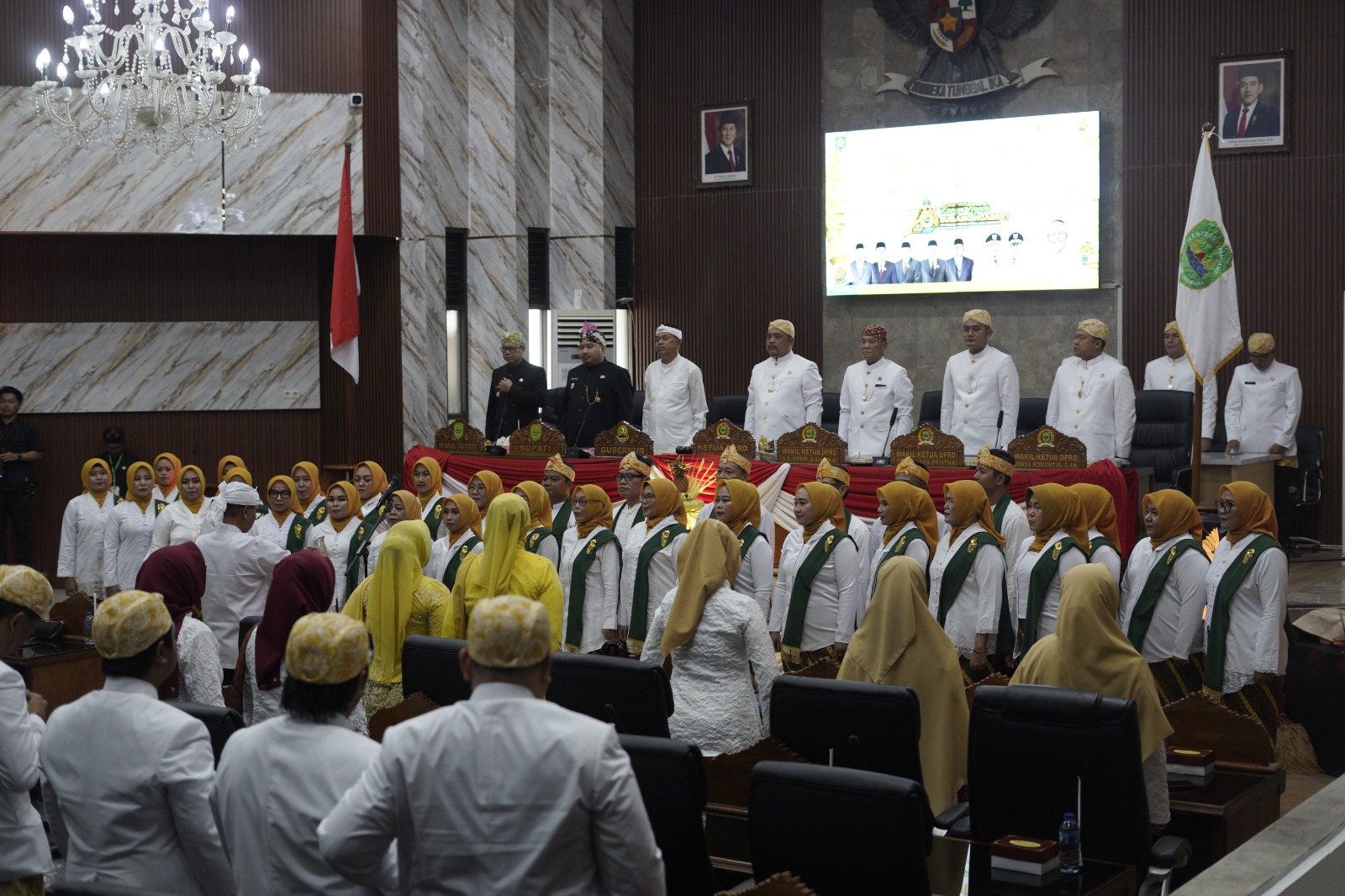 Rapat paripurna berlangsung khidmat dengan nuansa berbeda, diawali penampilan tarian, pembacaan sejarah Subang, serta paduan suara KORPRI yang membawakan lagu Indonesia Raya secara langsung, dilanjutkan dengan Hymne Subang.