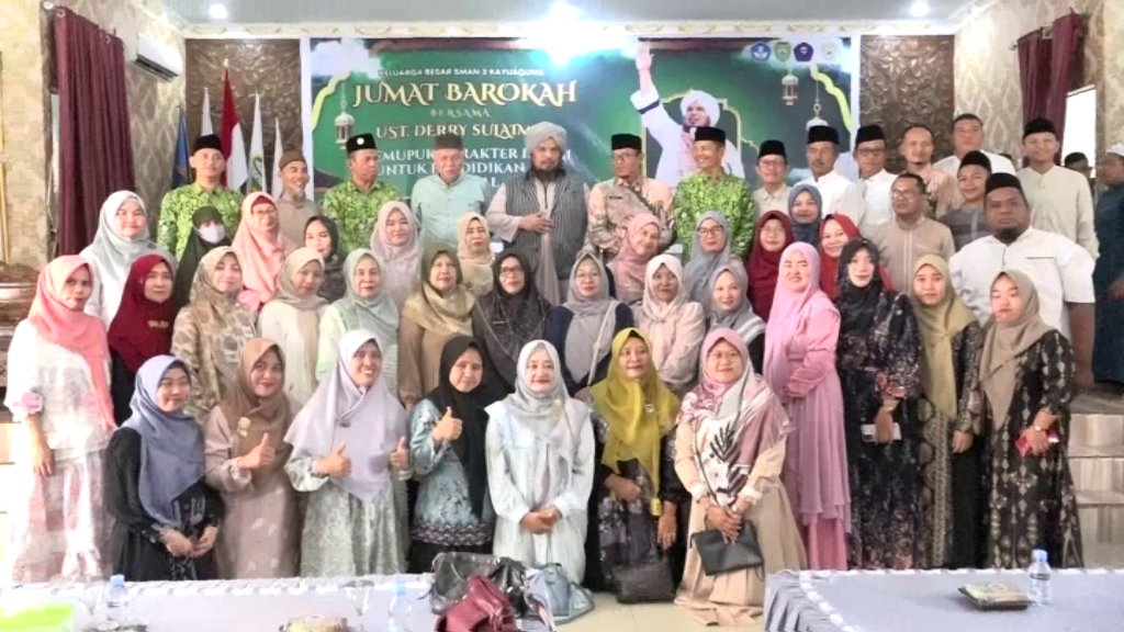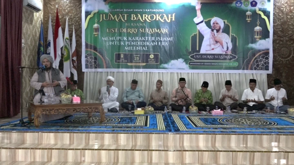 Kayuagung, OKI, cimutnews.co.id – Keluarga besar SMAN 3 Unggulan Kayuagung, Kabupaten Ogan Komering Ilir (OKI), menggelar kegiatan Jumat Barokah bersama dai kondang, Ustaz Derry Sulaiman, dengan tema “Memupuk Karakter Islami untuk Pendidikan Era Milenial”, Jumat (25/7/2025). Acara berlangsung di Aula SMAN 3 Unggulan Kayuagung dengan penuh khidmat dan antusias.