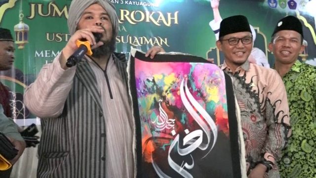 Di penghujung acara, Ustaz Derry menyerahkan sebuah lukisan kepada Kepala SMAN 3 Unggulan Kayuagung.
