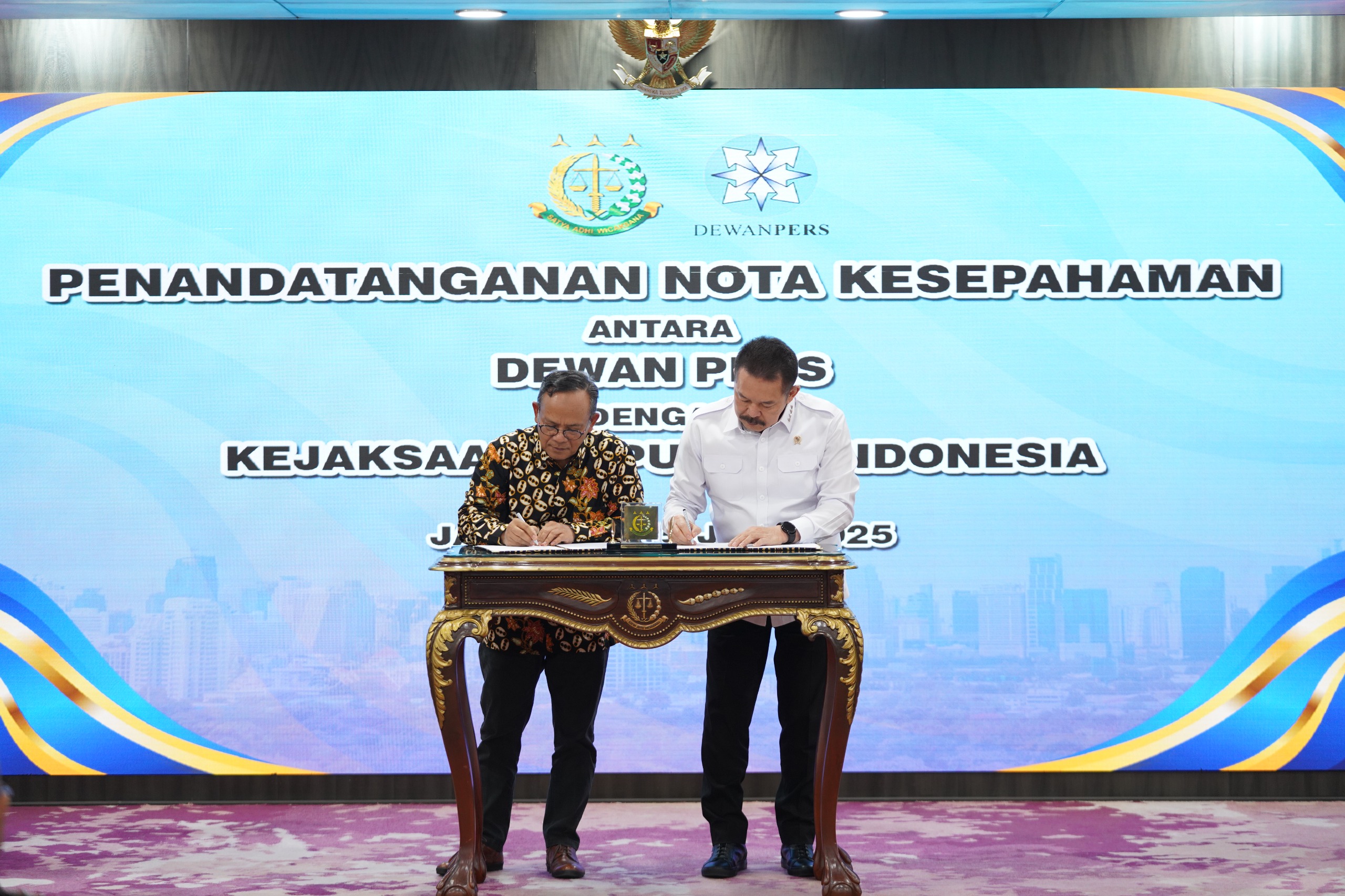 Kejaksaan Republik Indonesia dan Dewan Pers resmi menandatangani Nota Kesepahaman (MoU) tentang “Koordinasi dalam Mendukung Penegakan Hukum, Perlindungan Kemerdekaan Pers, Peningkatan Kesadaran Hukum Masyarakat, serta Peningkatan Kapasitas Sumber Daya Manusia”, pada Selasa, 15 Juli 2025 di Jakarta.