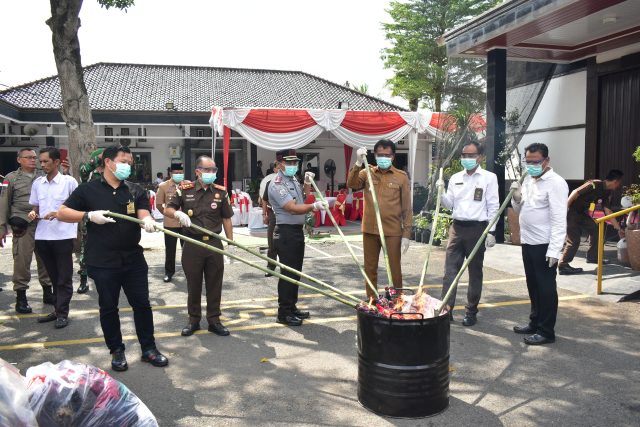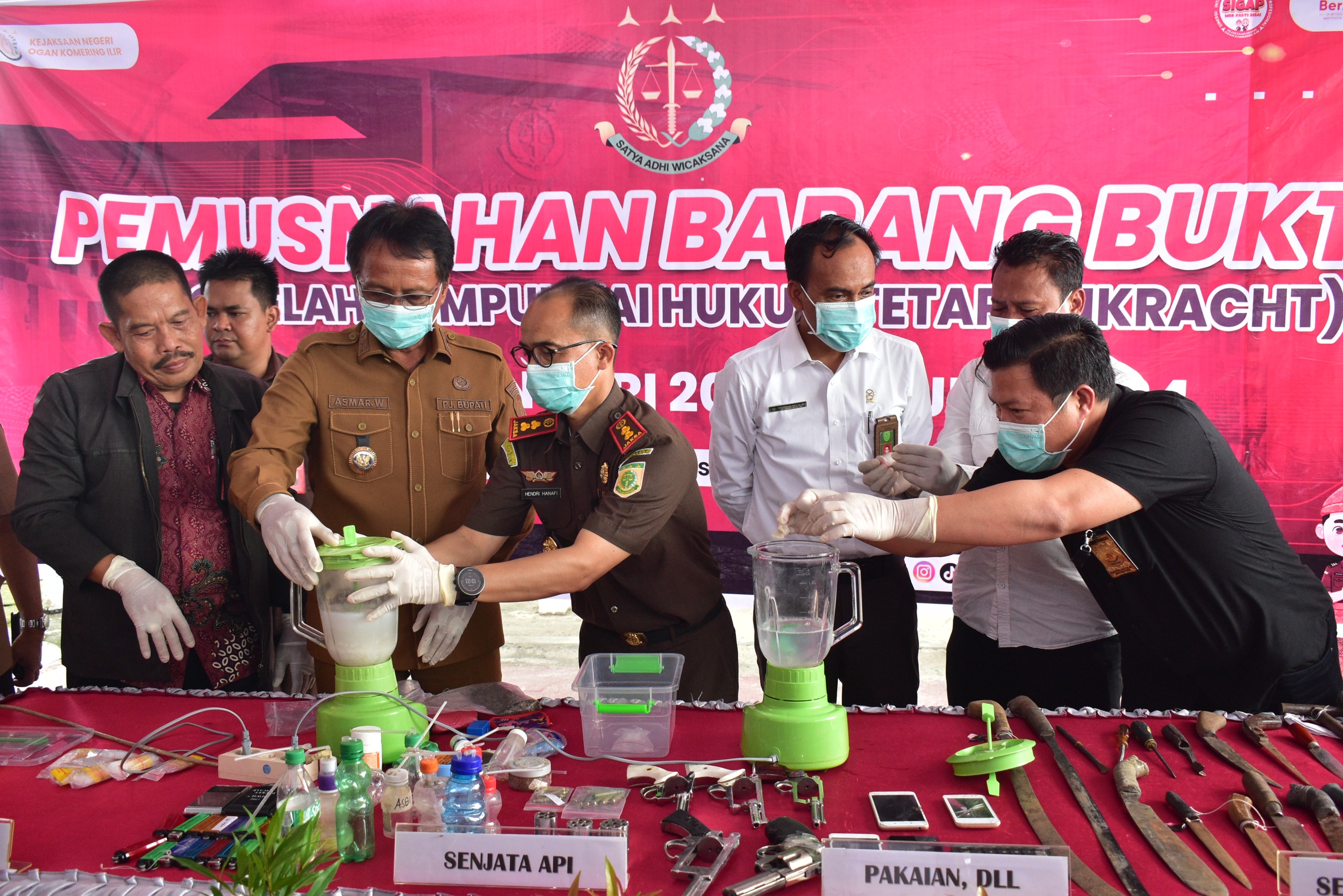 Pemusnahannya dengan cara diblender dan dicampur air kemudian dibuang ke toilet untuk Barang Bukti Narkotika, dipotong dengan mesin gerinda untuk barang bukti Senjata Api dan Senjata Tajam, serta untuk Barang Bukti Pakaian, dll dimusnahkan dengan cara dibakar.