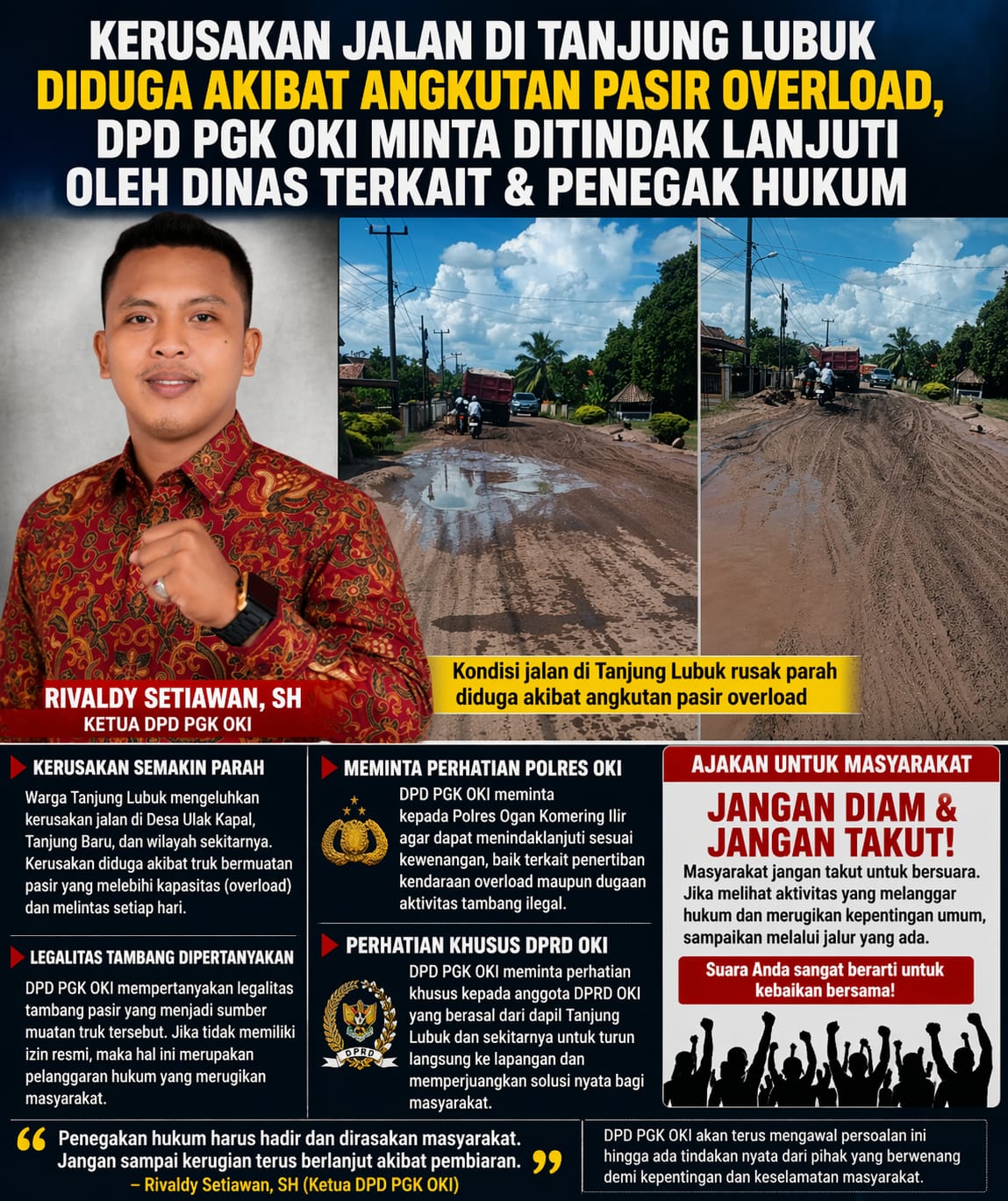 Kerusakan Jalan Di Tanjung Lubuk Diduga Akibat Angkutan Pasir Overload, Dpd Pgk Oki Desak Penertiban Dan Harapkan Perhatian Dprd Oki