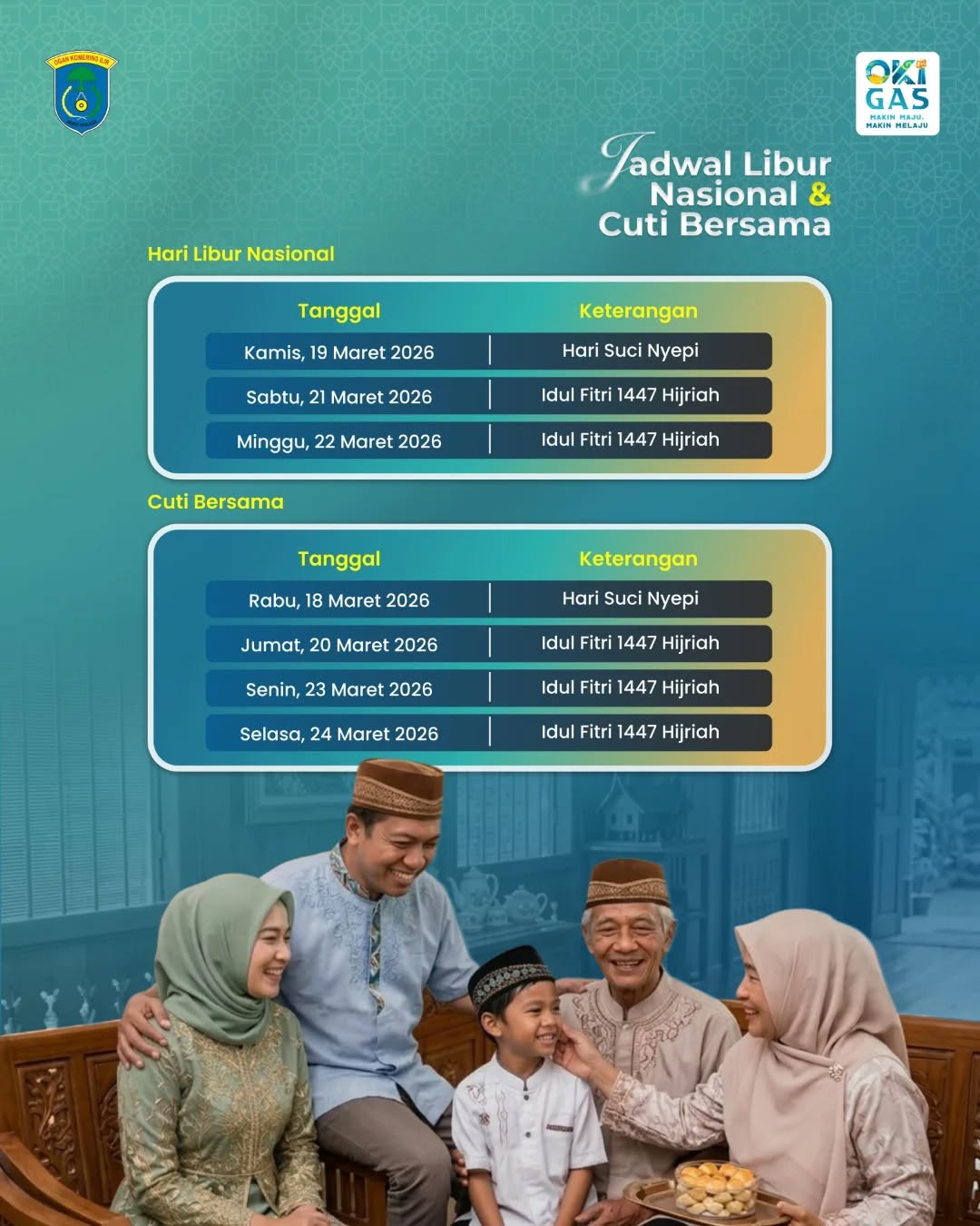 OKI, cimutnews.co.id – Pemerintah menetapkan libur nasional dan cuti bersama dalam rangka Hari Raya Idul Fitri 1447 Hijriah dan Hari Suci Nyepi 2026, yang menjadi momentum penting bagi masyarakat untuk berkumpul bersama keluarga, bersilaturahmi, serta beristirahat dari rutinitas, sekaligus diiringi imbauan untuk mengutamakan keselamatan selama perjalanan mudik.