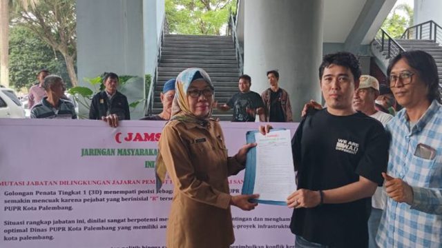 Palembang, cimutnews.co.id – Puluhan massa yang tergabung dalam Jaringan Masyarakat Sipil Anti Korupsi Indonesia (JAMSAKI) menggelar aksi damai di depan kantor DPRD Kota Palembang, Senin (6/10/2025). Mereka menyoroti dugaan kejanggalan dalam kebijakan mutasi jabatan di lingkungan Pemerintah Kota Palembang, khususnya penempatan seorang pejabat golongan Penata Tingkat I (III/D) sebagai Sekretaris Dinas Pekerjaan Umum dan Penataan Ruang (PUPR) Kota Palembang.