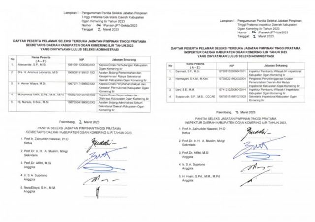 Dalam pengumuman yang ditandatangani oleh Ketua Pansel Prof. Ir. Zainuddin Nawawi Ph.D, sekretaris Prof. Dr. Ir. H. A. Muslim M.Agr dan tiga orang anggota pansel tersebut, terdapat lima calon sekda yang lolos seleksi administrasi diantaranya Alexsander SP M.Si (Kepala Dinas Perhubungan Kabupaten OKI). Kemudian Drs. H. Antonius Leonardo, M Si (Asisten Bidang Pemerintahan dan Kesejahteraan Rakyat Sekretariat Daerah Kabupaten OKI), selanjutnya Ir. Asmar Wijaya M.Si (Kepala Dinas Perumahan Rakyat dan Kawasan Permukiman Kabupaten OKI). Lalu, Muhammad Amin S.Pd MM M.Pd (Kepala Dinas Kepemudaan dan Olahraga Kabupaten OKI) serta Hj. Nursula S.Sos M.Si (Asisten Bidang Administrasi Umum Sekretariat Daerah Kabupaten OKI), sebagaimana dalam pengumuman Nomor : 06 /Pansel-JPT-Sekda/2023.