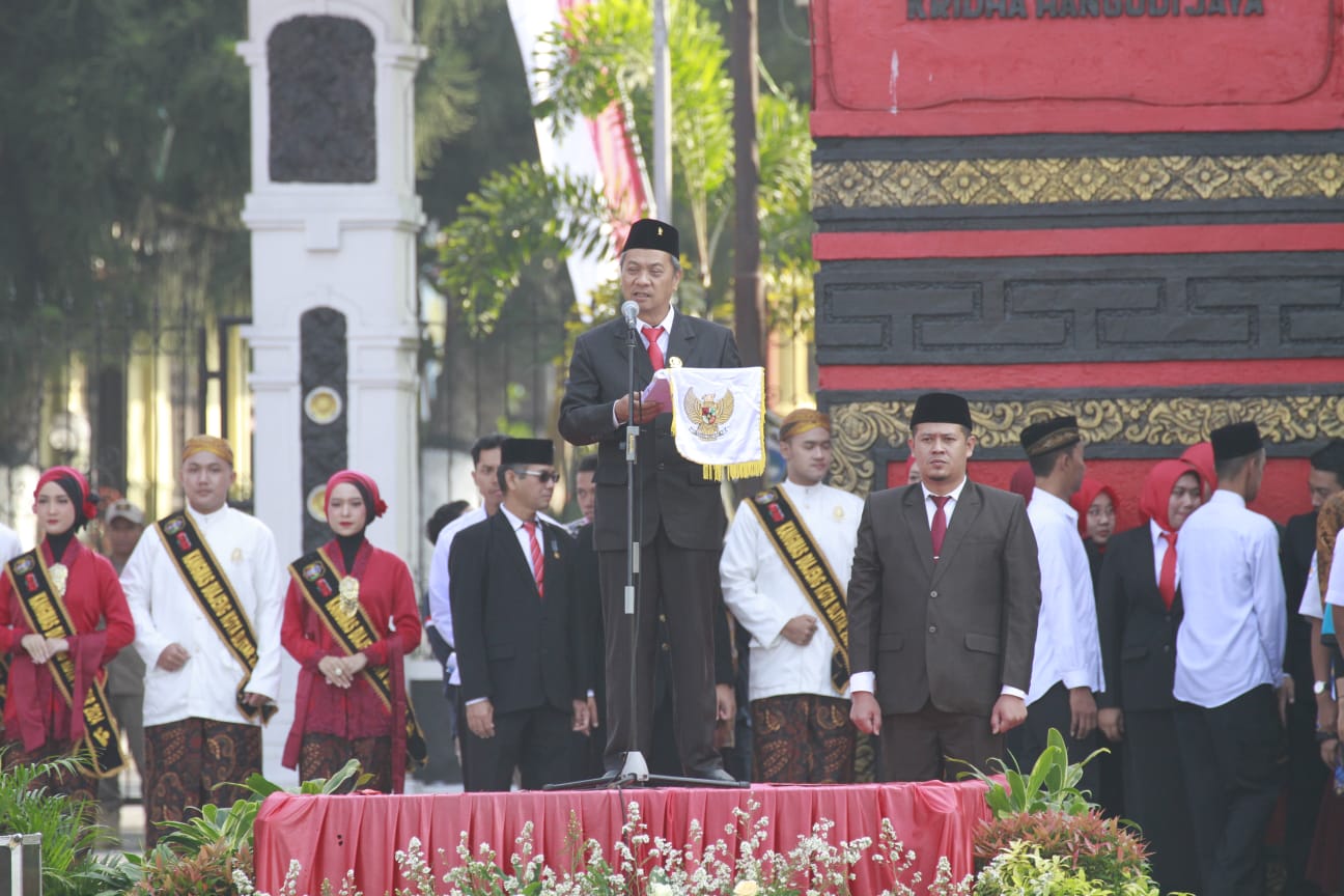 Dengan suara lantang dan penuh wibawa, Ketua DPRD Kota Blitar H.dr.Syahrul Alim membacakan teks sakral yang pertama kali dikumandangkan Soekarno–Hatta pada 17 Agustus 1945. Seluruh peserta upacara, mulai dari jajaran Forkopimda, TNI-Polri, ASN, pelajar, hingga masyarakat umum, berdiri tegap menyimak pembacaan tersebut dalam suasana yang menggetarkan hati.
