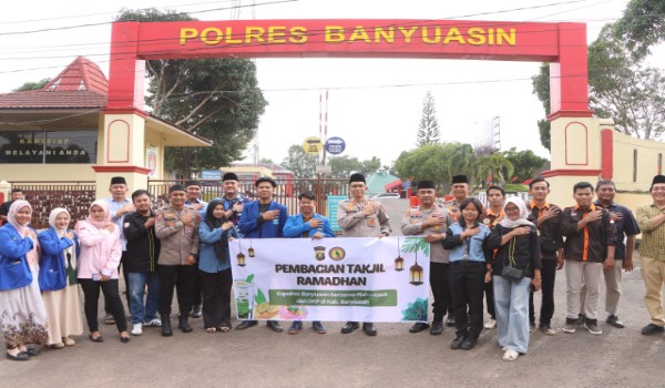 Banyuasin, cimutnews.co.id — Polres Banyuasin menggelar kegiatan sosial “Polres Banyuasin Berbagi Takjil” di depan Markas Komando (Mako) Polres Banyuasin, Selasa (3/3/2026) sekitar pukul 17.00 WIB. Kegiatan yang berlangsung menjelang waktu berbuka puasa tersebut menjadi momentum mempererat kebersamaan antara aparat kepolisian, mahasiswa, organisasi kepemudaan (OKP), serta masyarakat dalam semangat berbagi di bulan suci Ramadan.