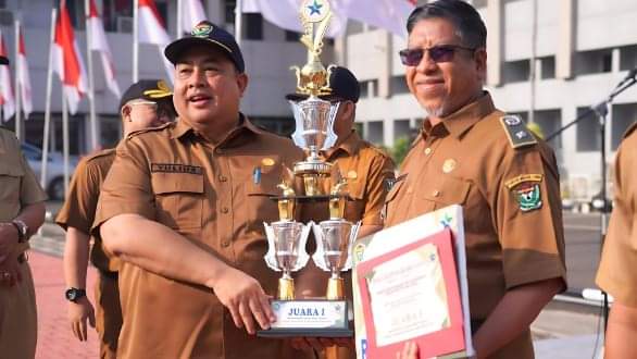 Piala dan piagam diserahkan Sekretaris Daerah Kabupaten Muara Enim, Yulius kepada Kepala Desa Tebat Agung, H. Riswandi Ahmadnudin pada Apel Gabungan Pemkab. Muara Enim Awal Agustus di halaman Kantor Bupati Muara Enim, Senin pagi (05/08).