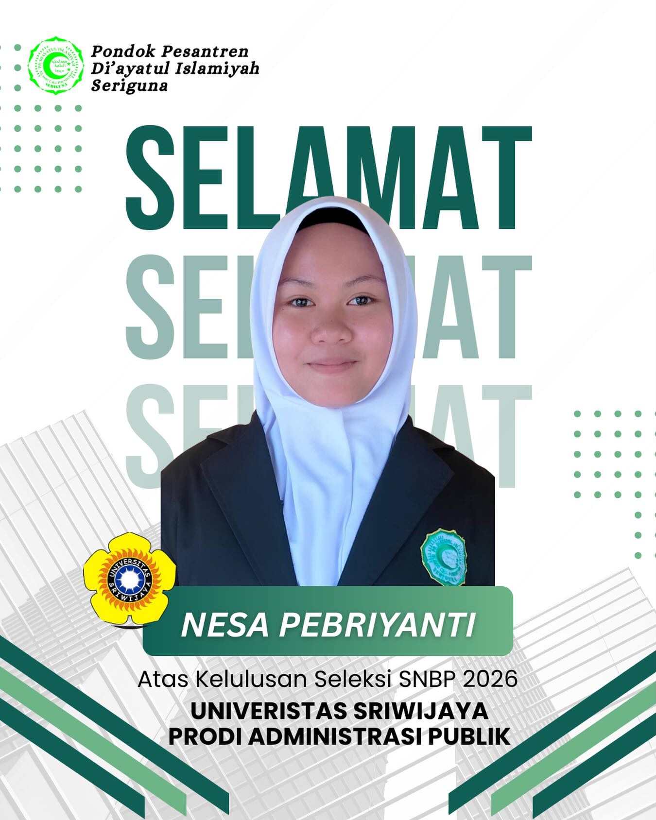 Santriwati tersebut adalah Nesa Periyanti, siswa kelas XII MA Di’ayatul Islamiyah Seriguna yang diterima melalui jalur Seleksi Nasional Berdasarkan Prestasi (SNBP) 2026. (4/4/2026)