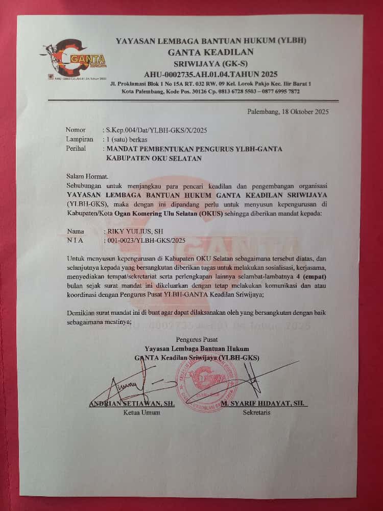 Palembang, cimutnews.co.id — Dalam upaya memperluas jangkauan layanan hukum dan memperkuat keberadaan lembaga di tingkat daerah, Yayasan Lembaga Bantuan Hukum Ganta Keadilan Sriwijaya (YLBH-GKS) resmi memberikan mandat pembentukan pengurus baru di Kabupaten Ogan Komering Ulu Selatan (OKU Selatan) (18/10/25)